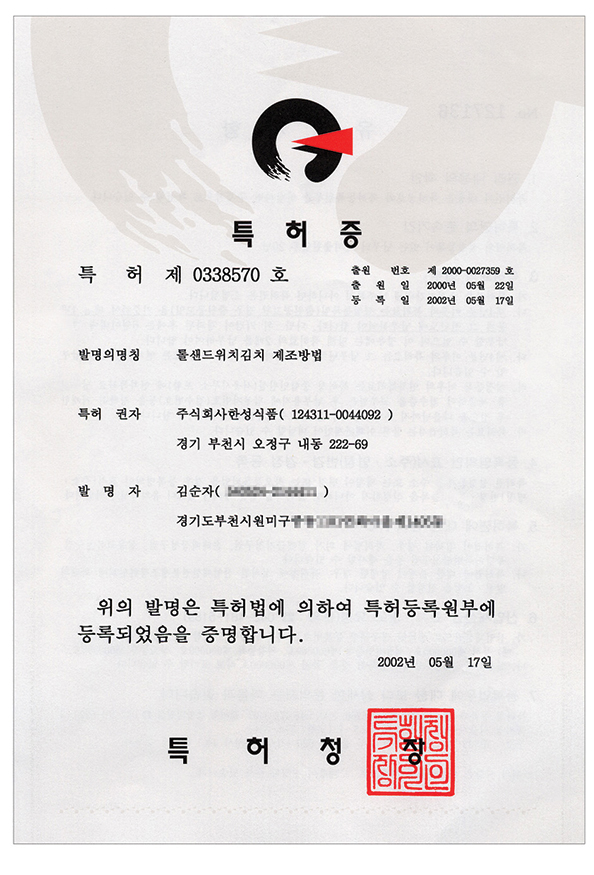 | 10 | 2002. 10. 22 | 0359473 | 무샌드위치김치 제조방법 |