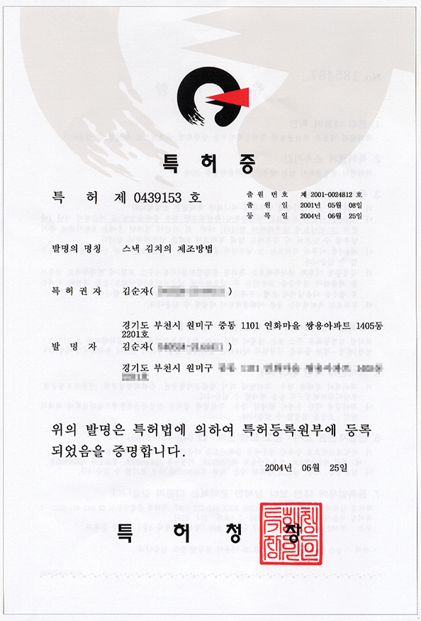 | 14 | 2004. 06. 25 | 0439153 | 스낵김치 제조방법 |