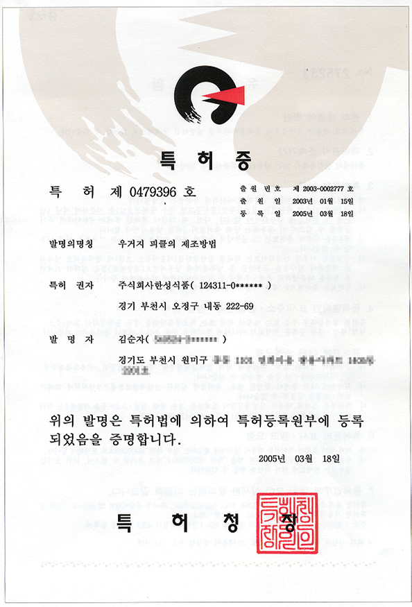 | 16 | 2005. 03. 18 | 0479396 | 우거지 피클 제조방법 |