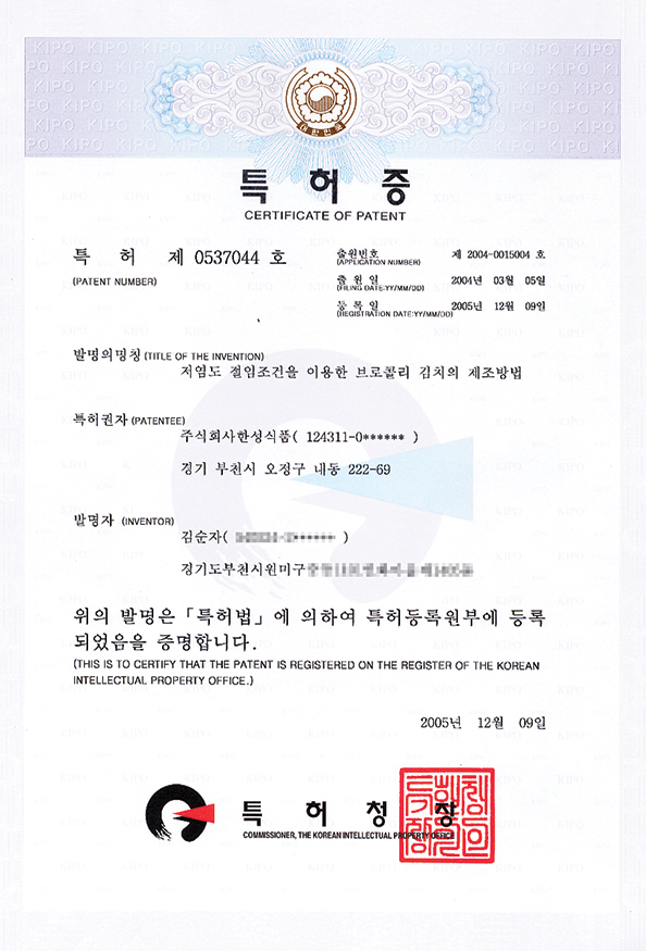 | 17 | 2005. 12. 09 | 0537044 | 저염도 브로콜리 김치 제조방법 |
