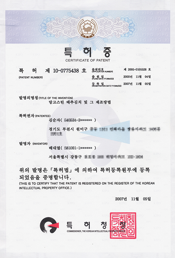| 18 | 2007. 11. 05 | 10-0775438 | 망고스틴 배추김치 제조방법 |