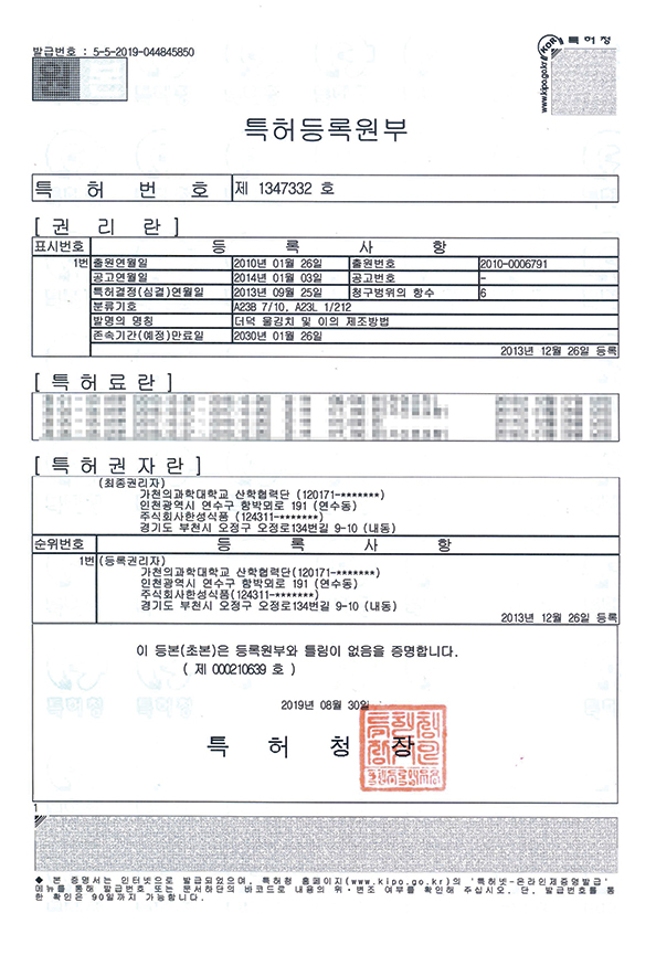 | 19 | 2011. 08. 01 | 10-1054941 | 백김치 막걸리 제조방법 |