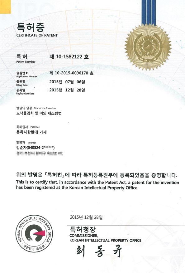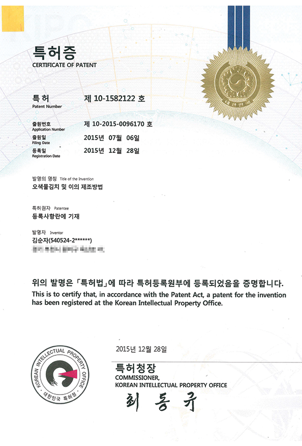 | 24 | 2015. 12. 28 | 10-1582122 | 오색물김치 및 이의 제조방법 |