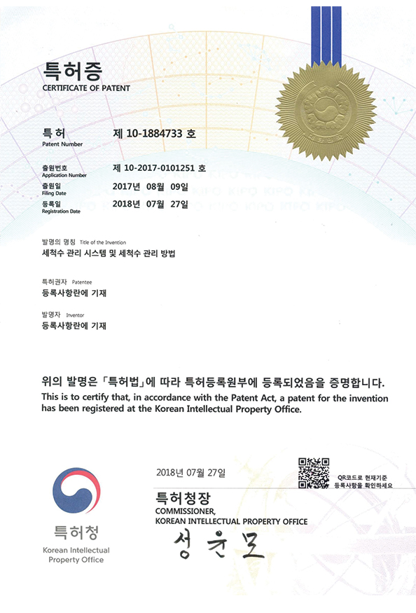 | 25 | 2018. 07. 27 | 10-1884733 | 세척수 관리 시스템 및 세척수 관리방법 |
