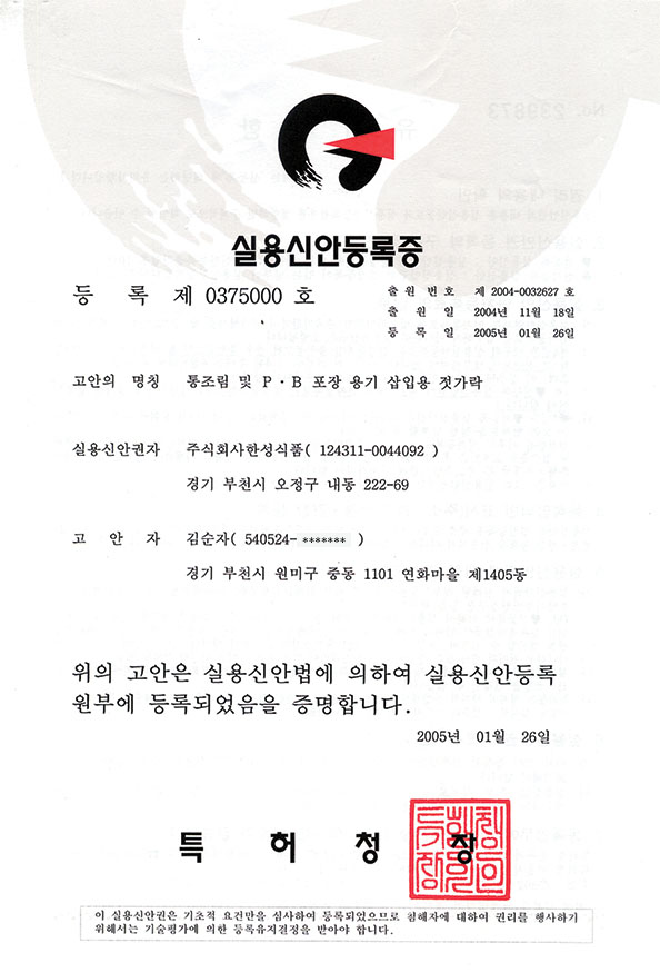 | 1 | 2005. 01. 26 | 0375000 | 통조림 및 P·B 포장용기 삽입용 젓가락 |